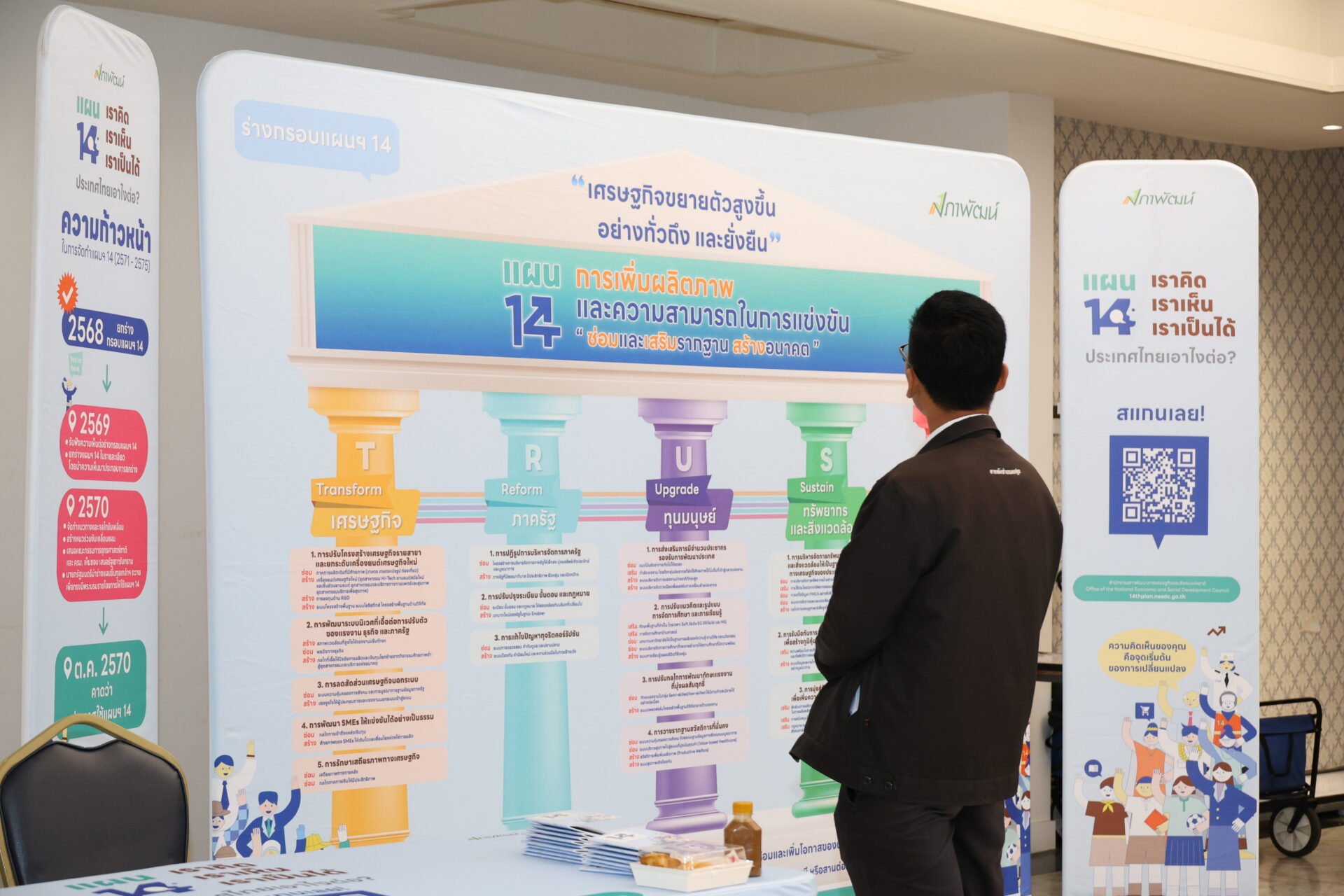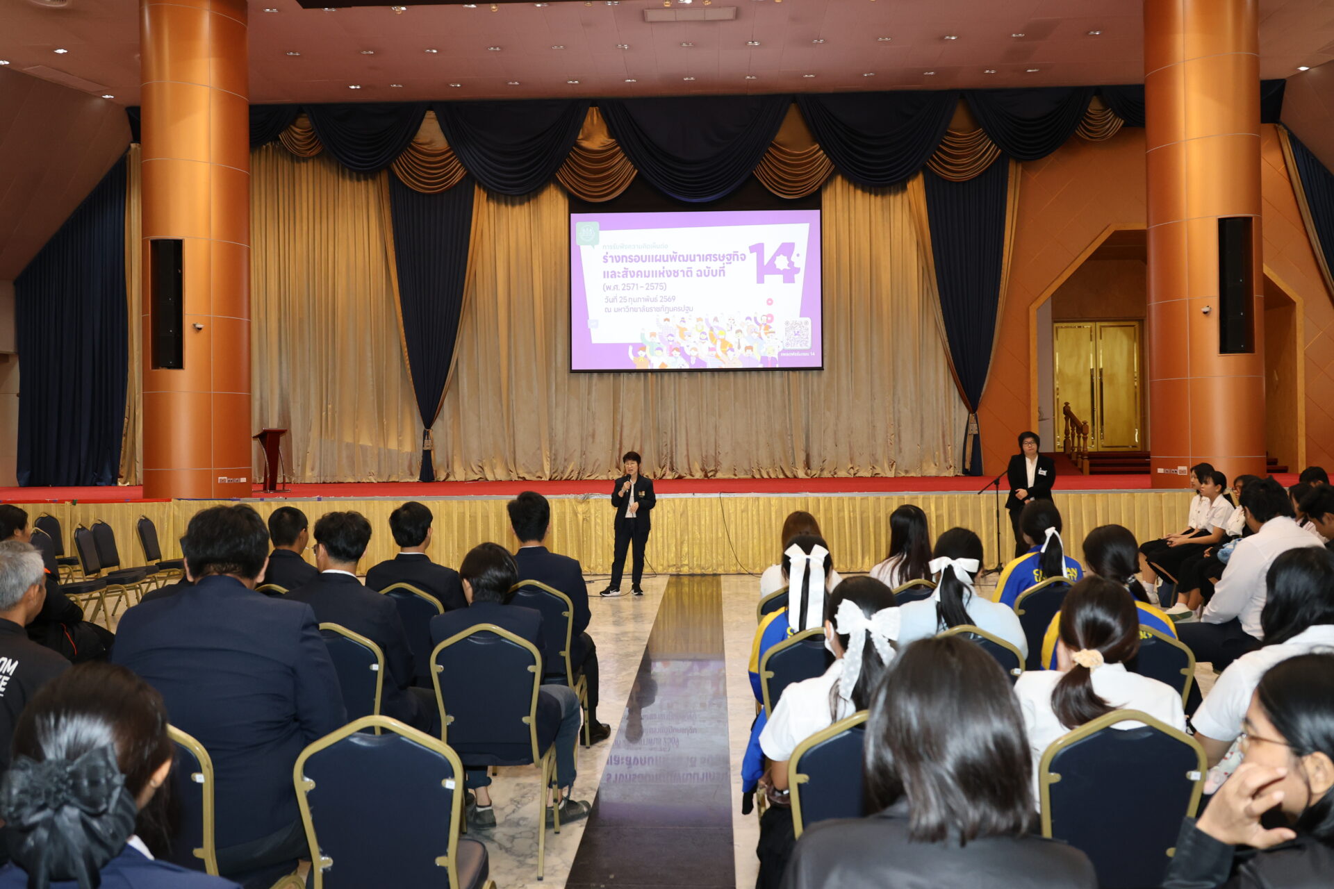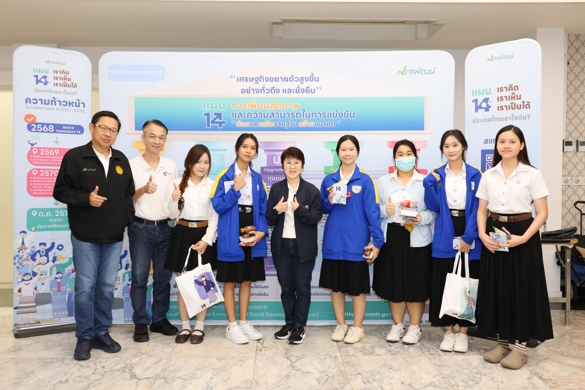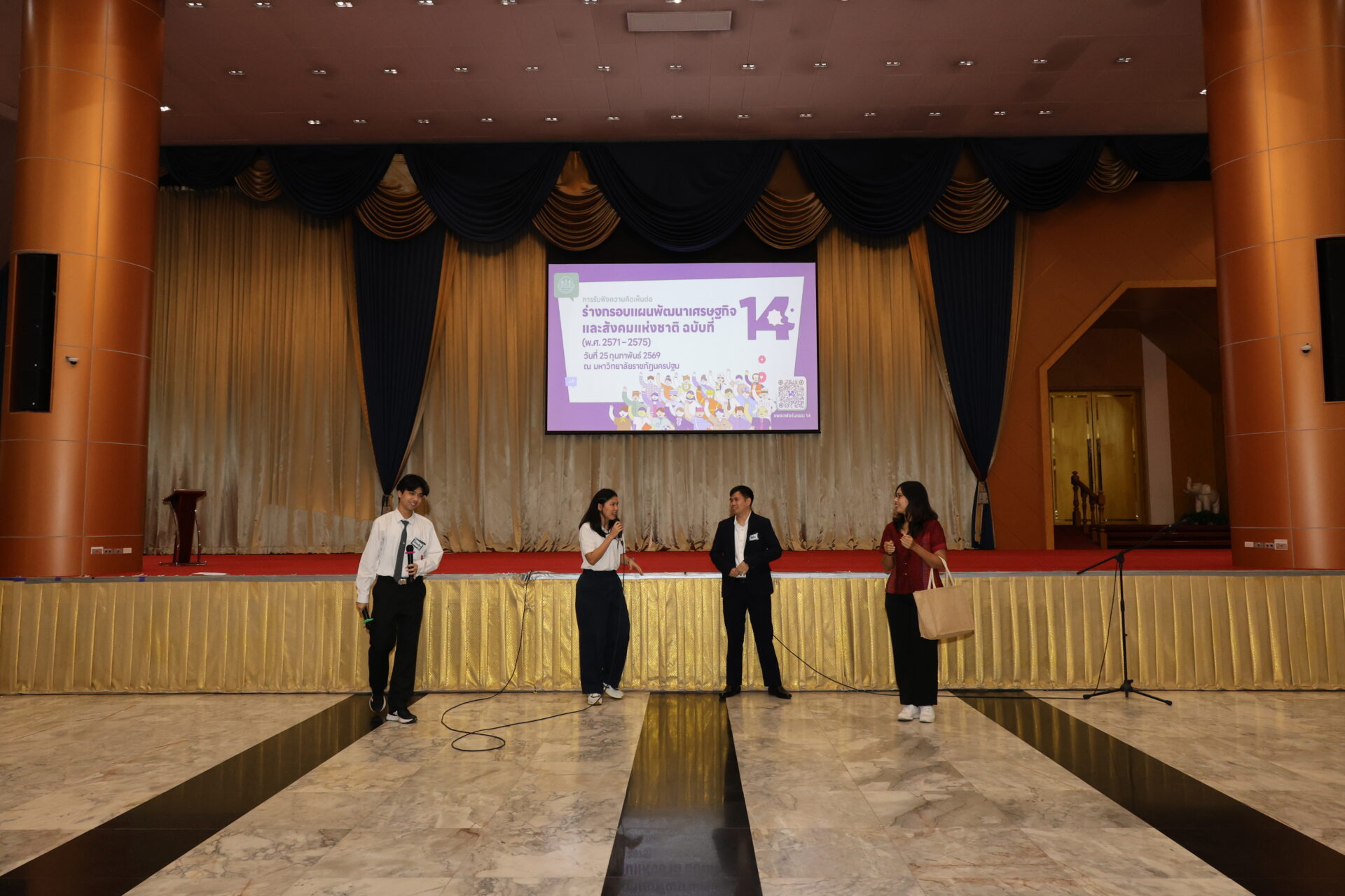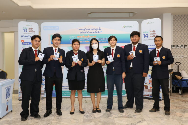 นอกจากนี้ เมื่อวันที่ 25 กุมภาพันธ์ 2569 สศช. ได้จัดกิจกรรมรับฟังความคิดเห็นจากกลุ่มนักเรียน/นักศึกษาในพื้นที่จังหวัดนครปฐม ณ มหาวิทยาลัยราชภัฏนครปฐม เนื่องจาก สศช. ให้ความสำคัญกับการมีส่วนร่วมของเยาวชนรุ่นใหม่ซึ่งเป็นอีกหนึ่งกำลังสำคัญในการพัฒนาประเทศ โดยกิจกรรมดังกล่าวได้นำเสนอสาระสำคัญของร่างกรอบแผนฯ ฉบับที่ 14 ผ่านการแสดงบทบาทสมมติ (Role Play) และการจัดบูธนิทรรศการสรุปสาระสำคัญและรับฟังความคิดเห็นของแต่ละเสาหลักการพัฒนา เพื่อสร้างความน่าสนใจให้ร่างแผนฯ และดึงดูดการมีส่วนร่วมของเยาวชนได้แสดงความความคิดเห็นและมุมมองต่าง ๆ ต่อร่างกรอบแผนพัฒนาฯ ฉบับที่ 14 ได้อย่างเต็มที่ โดยกิจกรรมในครั้งนี้ มีนักเรียน/นักศึกษาจากมหาวิทยาลัยราชภัฏนครปฐม วิทยาลัยการอาชีพพุทธมณฑล วิทยาลัยเทคนิคนครปฐม วิทยาลัยอาชีวศึกษานครปฐม และมหาวิทยาลัยคริสเตียนเข้าร่วมกว่า 150 คน