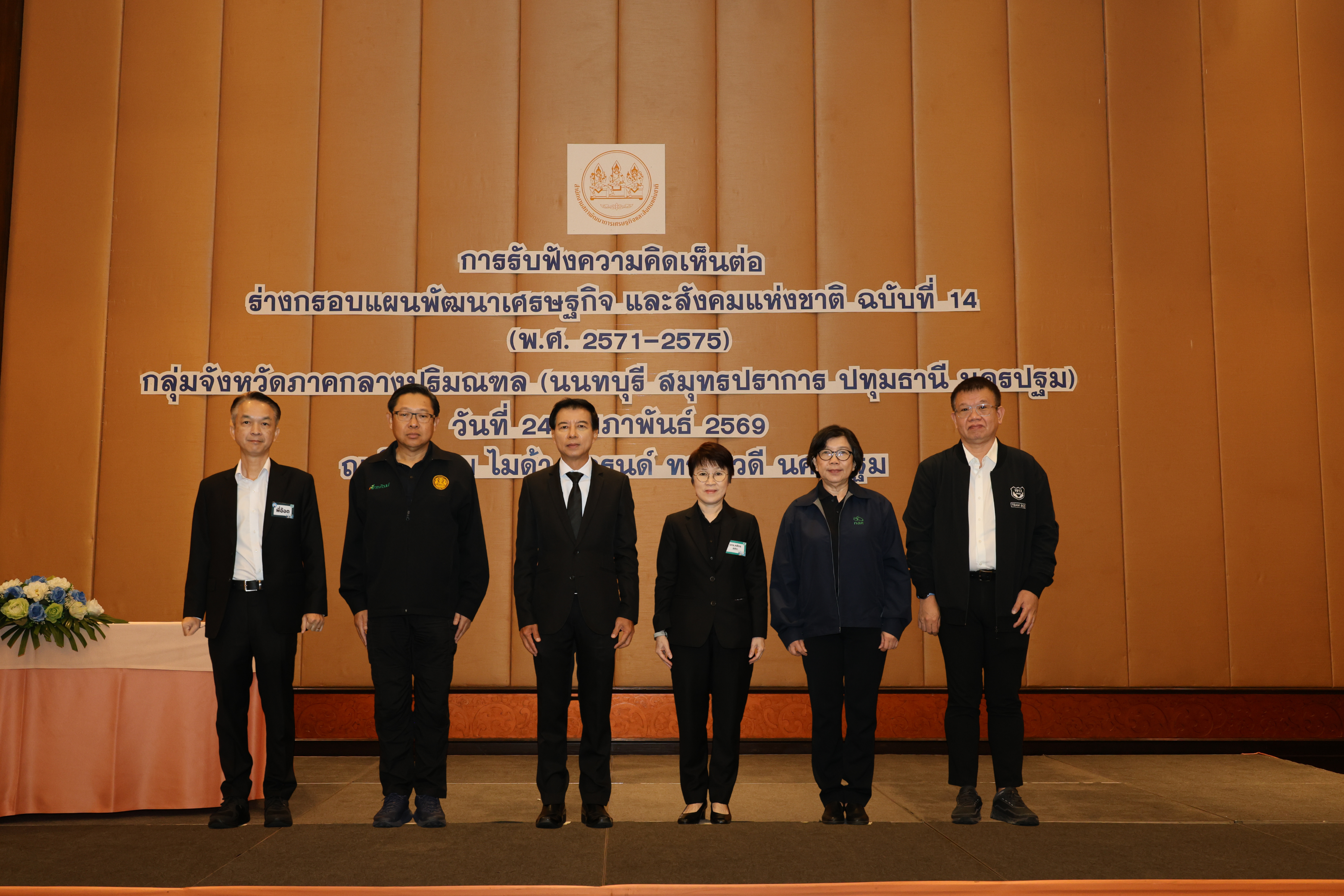 เมื่อวันที่ 24 กุมภาพันธ์ 2569 นายอารีย์ ชวลิตชีวินกุล กรรมการสภาพัฒนาการเศรษฐกิจและสังคมแห่งชาติ นางสาวศศิธร พลัตถเดช รองเลขาธิการสภาพัฒนาการเศรษฐกิจและสังคมแห่งชาติ รศ.ดร.ปัทมาวดี โพชนุกูล ประธานคณะกรรมการด้านการถ่ายทอดและลงทุนในวิจัย เทคโนโลยี และนวัตกรรม นายสุรรัฐ เนียมกลาง ที่ปรึกษาด้านนโยบายและแผนงาน และนายอธิพงศ์ หิรัญเรืองโชค ผู้อำนวยการกองยุทธศาสตร์และประสานการพัฒนาขีดความสามารถในการแข่งขัน พร้อมด้วยเจ้าหน้าที่ สศช. เปิดเวทีรับฟังความคิดเห็นต่อร่างกรอบแผนพัฒนาเศรษฐกิจและสังคมแห่งชาติ ฉบับที่ 14 ในกลุ่มจังหวัดภาคกลางปริมณฑล (นนทบุรี สมุทรปราการ ปทุมธานี และนครปฐม) ณ โรงแรม ไมด้า แกรนด์ ทวารวดี จังหวัดนครปฐม