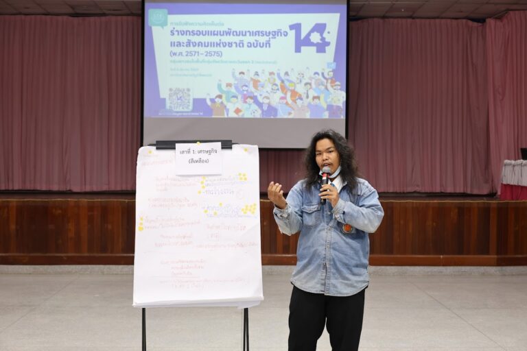 เมื่อวันที่ 5 มีนาคม 2569 นายศุภวุฒิ สายเชื้อ ประธานสภาพัฒนาการเศรษฐกิจและสังคมแห่งชาติ นางสาวรัสรินทร์ ชินโชติธีรนันท์ กรรมการสภาพัฒนาการเศรษฐกิจและสังคมแห่งชาติ พร้อมด้วย นายณฐพงศ์ วรรณรัตน์ รองเลขาธิการสภาพัฒนาการเศรษฐกิจและสังคมแห่งชาติ เปิดเวทีรับฟังความคิดเห็นในระดับพื้นที่กลุ่มจังหวัดภาคตะวันออก 2 (ปราจีนบุรี จันทบุรี ตราด นครนายก และสระแก้ว) ณ โรงแรม แซนด์ ดูนส์ เจ้าหลาวบีช รีสอร์ท จังหวัดจันทบุรี มีผู้เข้าร่วมจำนวน 180 คน ประกอบด้วย หน่วยงานภาครัฐ ภาคเอกชน ภาควิชาการ และภาคประชาสังคม โดยที่ประชุมได้แสดงความคิดเห็นต่อสาระสำคัญของร่างกรอบแผนพัฒนาเศรษฐกิจและสังคมแห่งชาติ ฉบับที่ 14 (พ.ศ. 2571 – 2575) ในภาพรวม อาทิ ควรสร้างความพร้อมและแก้ไขปัญหาสำคัญของประเทศ มากกว่าการตั้งเป้ามุ่งสู่อนาคตเพียงอย่างเดียว โดยให้ความสำคัญกับการสร้างความเข้มแข็งของเศรษฐกิจฐานราก การพัฒนาคุณภาพทุนมนุษย์ และการบริหารจัดการทรัพยากรอย่างยั่งยืน ควบคู่กับการปรับบทบาทภาครัฐให้มีประสิทธิภาพ โปร่งใส และเอื้อต่อการพัฒนาในระยะยาว และควรกำหนดหน่วยงานที่กำกับดูแลในแต่ละแนวทางการพัฒนาที่ชัดเจนเพื่อให้เกิดผลเป็นรูปธรรมและยั่งยืน นอกจากนี้ ยังได้แสดงความคิดเห็นต่อ 5 เสาหลักการพัฒนา ดังนี้