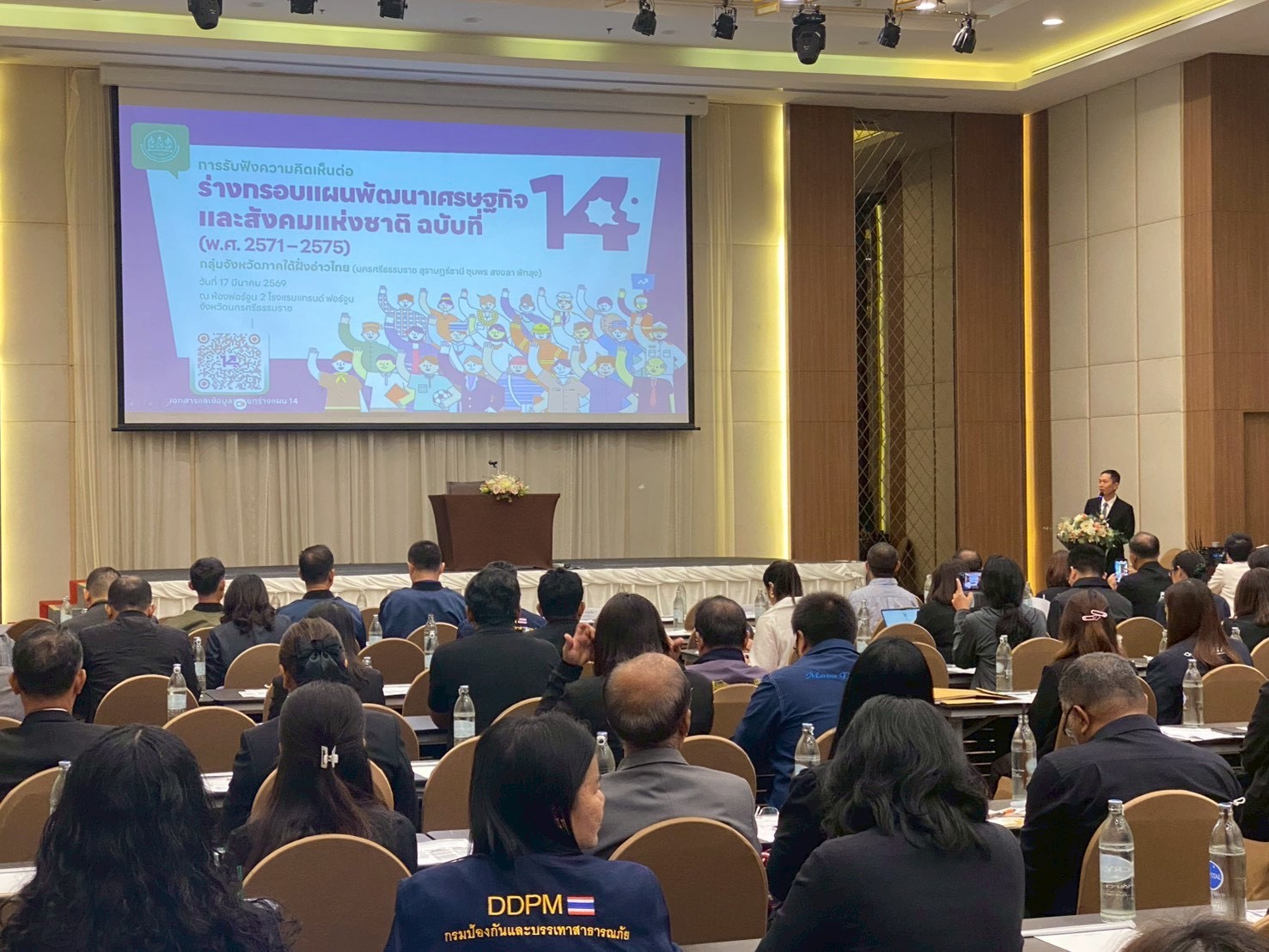 เมื่อวันที่ 17 มีนาคม 2569 ณ โรงแรมแกรนด์ ฟอร์จูน จังหวัดนครศรีธรรมราช ศาสตราจารย์ ดร.สนิท อักษรแก้ว ประธานคณะกรรมการยกร่างแผนด้านการบริหารจัดการทรัพยากรธรรมชาติและสิ่งแวดล้อมอย่างยั่งยืนและอดีตประธานสภาพัฒนาการเศรษฐกิจและสังคมแห่งชาติ นายกงกฤช หิรัญกิจ กรรมการสภาพัฒนาการเศรษฐกิจและสังคมแห่งชาติ ดร.วิชญายุทธ บุญชิต รองเลขาธิการสภาพัฒนาการเศรษฐกิจและสังคมแห่งชาติ พร้อมด้วยผู้บริหารและเจ้าหน้าที่สำนักงานสภาพัฒนาการเศรษฐกิจและสังคมแห่งชาติ (สศช.) ได้เปิดเวทีรับฟังความคิดเห็นต่อร่างกรอบแผนพัฒนาเศรษฐกิจและสังคมแห่งชาติ ฉบับที่ 14 (พ.ศ. 2571–2575) ในระดับพื้นที่ กลุ่มจังหวัดภาคใต้ฝั่งอ่าวไทย ประกอบด้วย จังหวัดชุมพร สุราษฎร์ธานี นครศรีธรรมราช พัทลุง และสงขลา โดยมีผู้เข้าร่วมการประชุมจากภาครัฐ ภาคเอกชน ภาคการศึกษา และภาคประชาสังคม จำนวน 197 คน