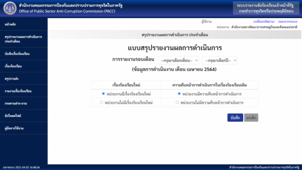 การรายงานข้อมูลเรื่องกล่าวหาร้องเรียนเจ้าหน้าที่ของรัฐในสังกัด 2564