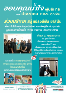 กิจกรรมเพื่อสังคม ประชาคม สศช. สนับสนุน สบู่ ยาสีฟัน และแปรงสีฟัน ให้กับมูลนิธิอาสาเพื่อนพึ่ง (ภาฯ) ยามยาก เพื่อใช้การจัดกิจรรมจัดถุงยังชีพ   18 ส.ค. 2560