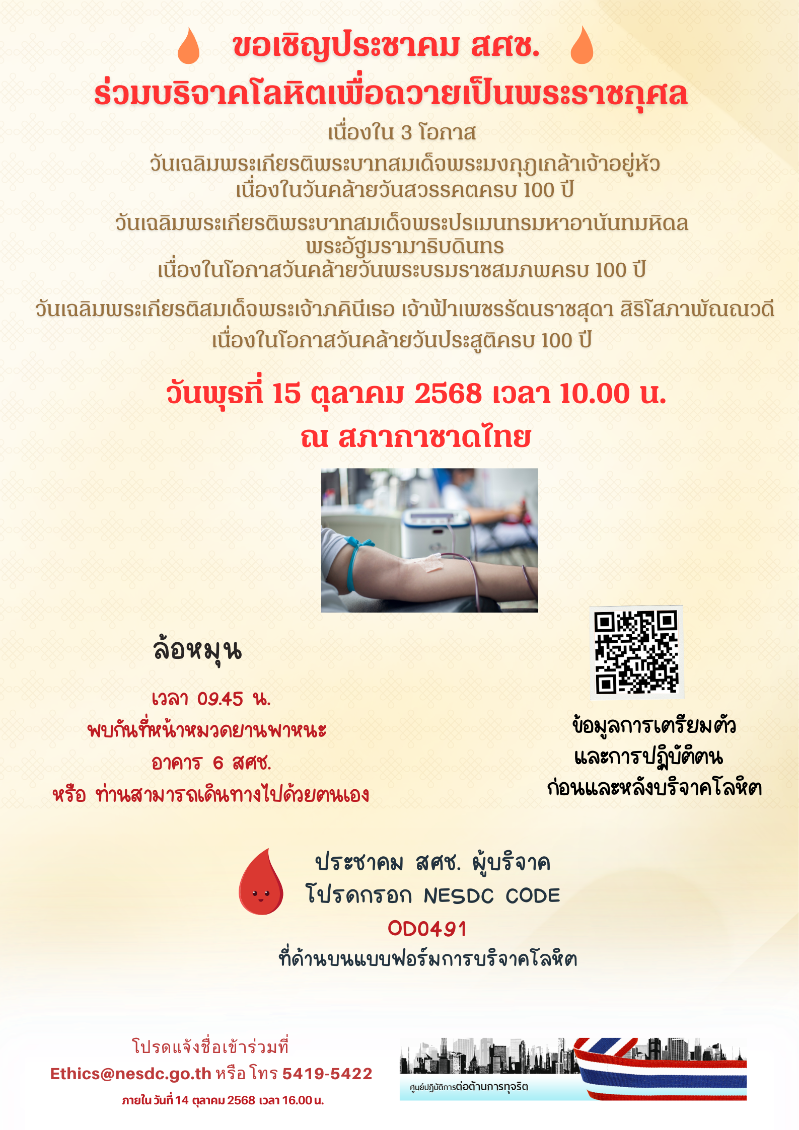 ขอเชิญร่วมบริจาคโลหิต ณ ศูนย์บริการโลหิตแห่งชาติ สภากาชาดไทย วันพุธที่ 15 ตุลาคม 2568 เวลา 10.00 น. พบกันเวลา 9.45 น. ที่หน้าหมวดยานพาหนะ อาคาร 6 สศช. ศปท. 19 ก.ย. 2568