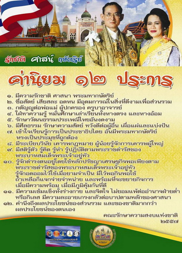 ค่านิยม ๑๒ ประการ (คณะรักษาความสงบแห่งชาติ ๒๕๕๗) ค่านิยม ๑๒ ประการ (คณะรักษาความสงบแห่งชาติ ๒๕๕๗)   28 ก.ค. 2557
