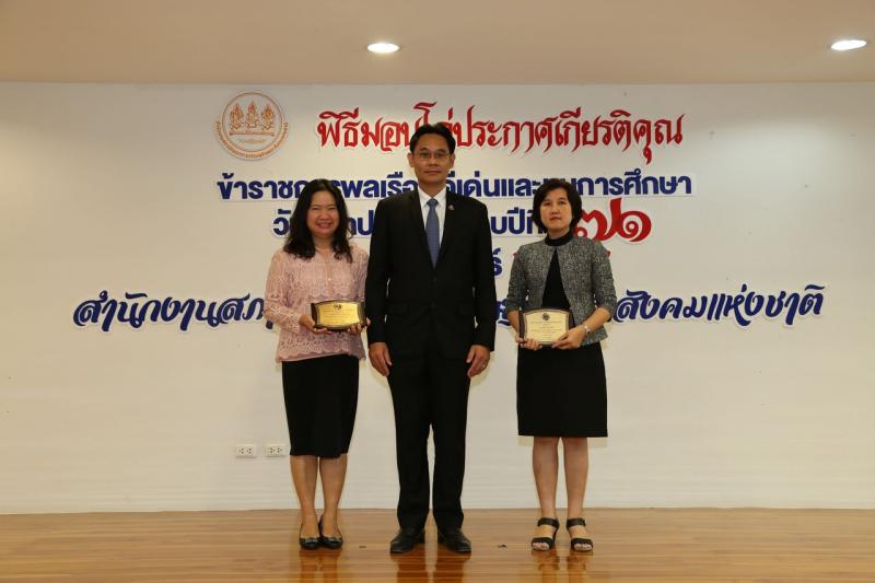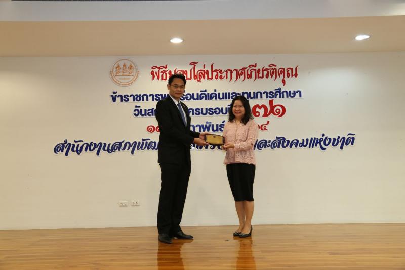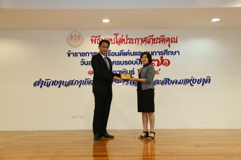 จากนั้น เลขาธิการ สศช. เป็นประธานในพิธีมอบโล่ประกาศเกียรติคุณข้าราชการพลเรือนดีเด่นของ สศช. 2 คน ได้แก่ นางสาวอานันท์ชนก สกนวัฒน์ รักษาการในตำแหน่งผู้เชี่ยวชาญด้านแบบจำลองเศรษฐกิจ กองยุทธศาสตร์และการวางแผนเศรษฐกิจมหภาค และนางอภิญญา เนตรสุขำ นักวิชาการและบัญชีชำนาญการพิเศษ สำนักงานเลขาธิการ (ฝ่ายคลัง) และมอบทุนการศึกษาแก่บุตร-ธิดาของข้าราชการ ลูกจ้างประจำ และพนักงานราชการ พร้อมทั้งร่วมประกาศเจตนารมณ์และปฏิญาณตนต่อต้านการทุจริตและคอร์รัปชั่น ณ ห้องแถลงข่าว อาคาร 5 ชั้น 1