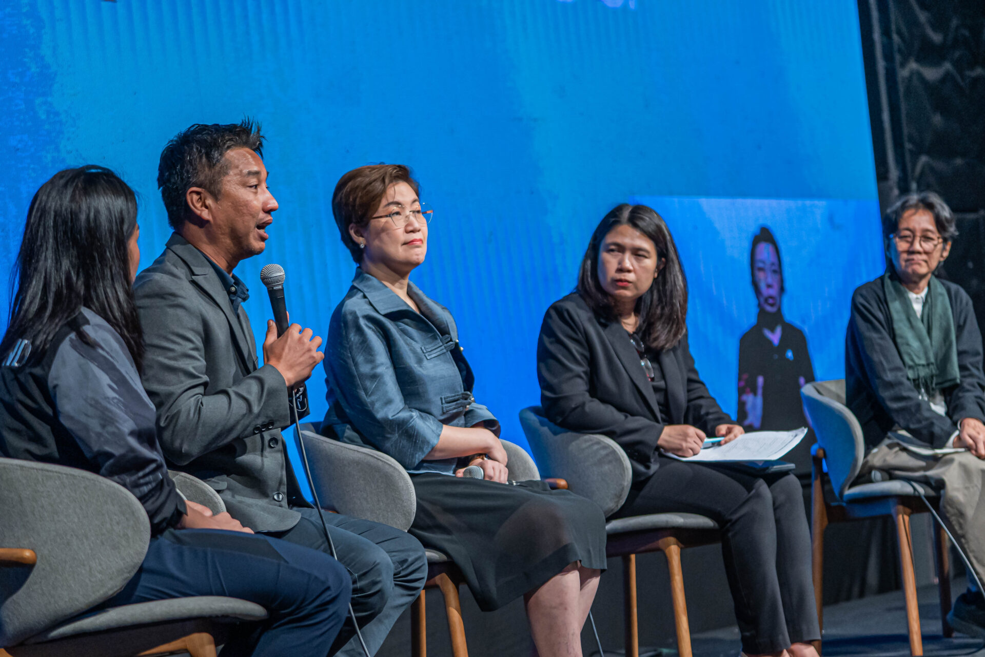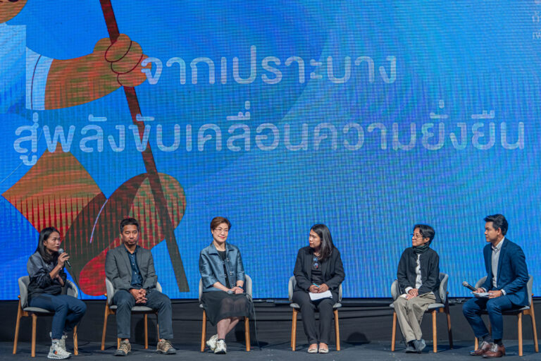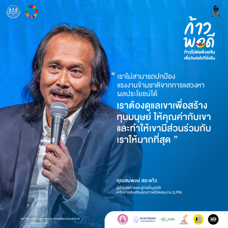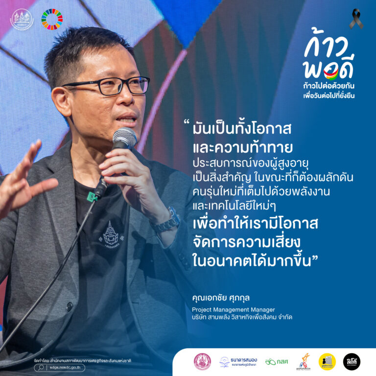 เวทีเสวนาช่วงที่ 2 ในหัวข้อ “ร่วมมือข้ามรุ่น: หุ้นส่วนความยั่งยืนที่ไม่ทิ้งใครไว้ข้างหลัง” ประกอบด้วยวิทยากร ได้แก่ (1) คุณปกรณ์วิศว์ เวียงศรีพนาวัลย์ ผู้ร่วมก่อตั้งกลุ่มริทัศน์บางกอก (RTUS-Bangkok) ได้เน้นย้ำความสำคัญในการเร่งดึงคนจากทุกภาคส่วน กลุ่มคนจากทุกช่วงอายุ กลุ่มแรงงาน และกลุ่มผู้ประกอบการมารวมตัวเป็นเครือข่าย ซึ่งจะทำให้เรามีอำนาจในการต่อรองกับภาครัฐ (2) คุณครรชิต เข็มเฉลิม กรรมการมูลนิธิพัฒนาไท และวุฒิอาสาธนาคารสมอง จ. ฉะเชิงเทรา อยากเห็นการมีส่วนร่วมระหว่างชุมชน เอกชน และรัฐบาลมากกว่านี้ ที่ผ่านมาพวกเราก็พยายามเข้าร่วมและสะท้อนว่ามีปัญหาอะไรบ้าง แต่เห็นว่าปัญหายังไม่ได้รับการแก้ไขจากภาครัฐ (3) คุณเอกชัย ศุภกุล Project Management Manager บริษัท สานพลัง วิสาหกิจเพื่อสังคม จํากัด เห็นว่าความร่วมมือข้ามรุ่นนับเป็นทั้งโอกาสและความท้าทาย ประสบการณ์ของผู้สูงอายุเป็นสิ่งสำคัญ ในขณะที่ก็ต้องผลักดันคนรุ่นใหม่ที่เต็มไปด้วยพลังงานและเทคโนโลยีใหม่ ๆ เพื่อทำให้เรามีโอกาสจัดการความเสี่ยงในอนาคตได้มากขึ้น (4) คุณละอองดาว สีจันทร์แจ้ง ผู้เชี่ยวชาญเฉพาะด้านส่งเสริมสวัสดิการสังคม กรมพัฒนาสังคมและสวัสดิการ เห็นว่าอาจจะต้องมีการปรับเปลี่ยน Mindset ของกลุ่มคนทั้งสามรุ่น โดยผู้อาวุโสต้องไม่มองว่าเด็กไม่มีความอดทน ผู้ใหญ่ควรจะต้องเป็นตัวเชื่อมประสานระหว่างคนรุ่นเก่ากับคนรุ่นใหม่ ส่งผลให้เกิดความยั่งยืนในพื้นที่มากยิ่งขึ้น และ (5) คุณสมพงษ์ สระแก้ว ผู้อำนวยการและผู้ก่อตั้งมูลนิธิเครือข่ายส่งเสริมคุณภาพชีวิตแรงงาน (LPN) มีความเห็นว่าเราไม่สามารถปกป้องแรงงานข้ามชาติจากการถูกแสวงหาผลประโยชน์ได้ แต่มีความจำเป็นต้องดูแลคนกลุ่มนี้ ในด้านการพัฒนาทุนมนุษย์ เน้นการสร้างและต่อยอดคุณค่า ส่งผลให้เกิดการมีส่วนร่วมในทุกภาคส่วนอย่างมีประสิทธิภาพ
