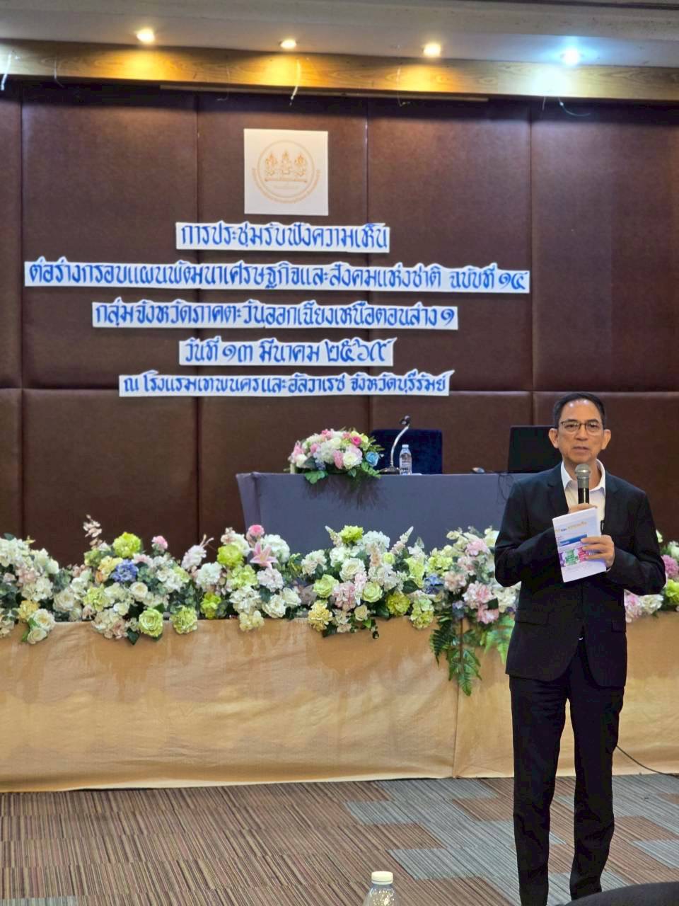 เมื่อวันที่ 13 มีนาคม 2569 นางภาวิณา อัศวมณีกุล รองเลขาธิการสภาพัฒนาการเศรษฐกิจและสังคมแห่งชาติ พร้อมด้วย นายกงกฤช หิรัญกิจ กรรมการสภาพัฒนาการเศรษฐกิจและสังคมแห่งชาติ ผู้บริหารและเจ้าหน้าที่ สศช. ได้จัดเวทีรับฟังความคิดเห็นร่วมกับผู้แทนจากภาคส่วนต่าง ๆ ใน กลุ่มจังหวัดภาคตะวันออกเฉียงเหนือตอนล่าง 1 ประกอบด้วย จังหวัดนครราชสีมา บุรีรัมย์ สุรินทร์ และชัยภูมิ ณ ห้องประชุมประโคนชัย โรงแรมอัลวาเรซ จังหวัดบุรีรัมย์ โดยมีผู้เข้าร่วมมากกว่า 160 คน