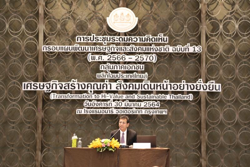 เมื่อวันที่ 30 มีนาคม 2564 นายวิโรจน์ นรารักษ์ รองเลขาธิการสภาพัฒนาการเศรษฐกิจและสังคมแห่งชาติ เป็นประธานการประชุมระดมความเห็นต่อ “กรอบแผนพัฒนาเศรษฐกิจและสังคมแห่งชาติ ฉบับที่ 13 (พ.ศ. 2566 – 2570)” กลุ่มภาคเอกชน ณ ห้องประชุม Ballroom 1 และ 2 โรงแรมอมารี วอเตอร์เกท ประตูน้ำ กรุงเทพฯ โดยมีผู้เข้าร่วมประชุม อาทิ นายชำนาญ ศรีสวัสดิ์ ประธานสภาอุตสาหกรรมท่องเที่ยวแห่งประเทศไทย นางสาวกัณญภัค ตันติพิพัฒน์พงศ์ ประธานสภาผู้ส่งสินค้าทางเรือแห่งประเทศไทย ดร.ปิยะนุช มาลากุล ณ อยุธยา รองประธานสายงานเศรษฐกิจและวิชาการ สภาอุตสาหกรรมแห่งประเทศไทย นายคมกริช นาคะลักษณ์ กรรมการยุทธศาสตร์ Investment หอการค้าไทย สภาหอการค้าแห่งประเทศไทย นายพชรพจน์ นันทรามาศ ผู้ช่วยกรรมการผู้จัดการใหญ่ ธนาคารกรุงไทย จำกัด (มหาชน) สมาคมธนาคารไทย และผู้แทนภาคเอกชน จำนวนประมาณ 150 คน