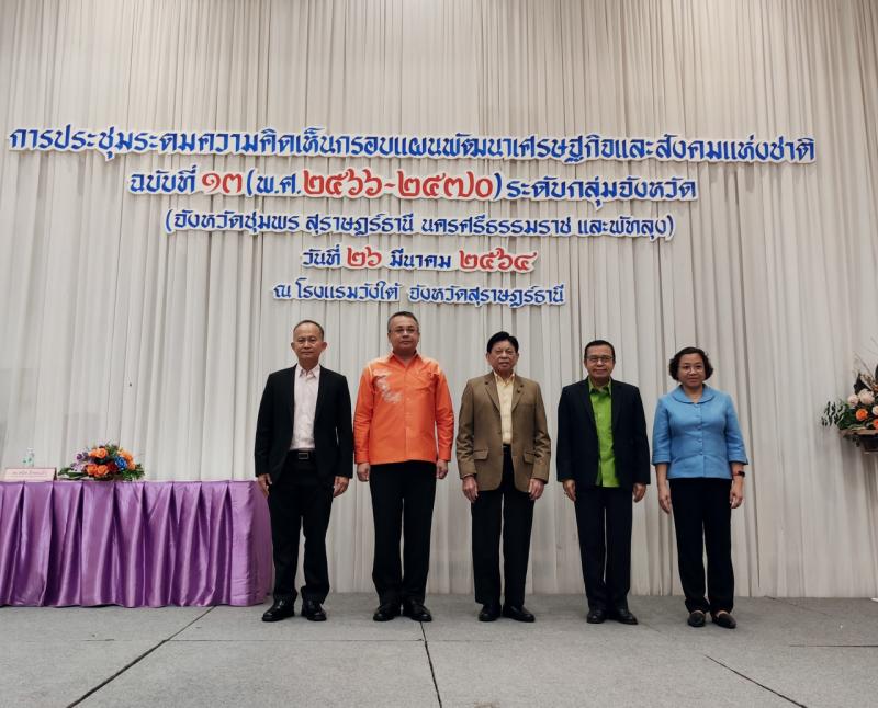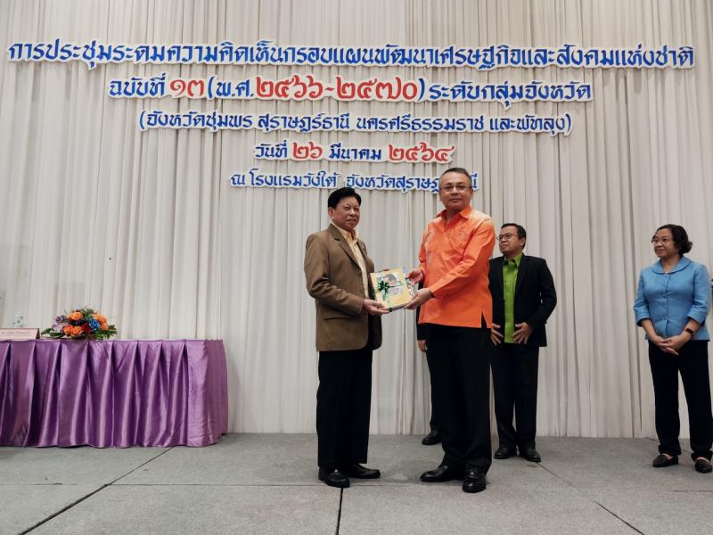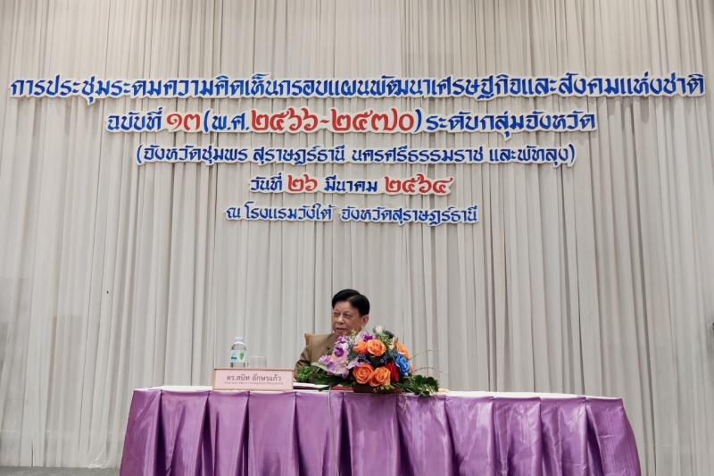 เมื่อวันที่ 26 มีนาคม 2564 ศาสตราจารย์ ดร.สนิท อักษรแก้ว ประธานสภาพัฒนาการเศรษฐกิจและสังคมแห่งชาติ เป็นประธานการประชุม และนางธิดา พัทธธรรม รองเลขาธิการสภาพัฒนาการเศรษฐกิจและสังคมแห่งชาติ เป็นผู้นำเสนอในการประชุมระดมความเห็นต่อ “กรอบแผนพัฒนาเศรษฐกิจและสังคมแห่งชาติ ฉบับที่ 13 (พ.ศ. 2566 – 2570)” ระดับกลุ่มจังหวัดภาคใต้ฝั่งอ่าวไทย (ชุมพร สุราษฎร์ธานี นครศรีธรรมราช และพัทลุง) ณ โรงแรมวังใต้ จังหวัดสุราษฎร์ธานี โดยได้รับเกียรติจาก นายวิชวุทย์ จินโต ผู้ว่าราชการจังหวัดสุราษฎร์ธานี เป็นประธานกล่าวเปิดงาน รวมทั้งมีผู้บริหารระดับจังหวัดที่เข้าร่วมประชุม อาทิ นายธีระ อนันตเสรีวิทยา ผู้ว่าราชการจังหวัดชุมพร และนายกู้เกียรติ วงศ์กระพันธุ์ ผู้ว่าราชการจังหวัดพัทลุง และผู้ร่วมประชุมประกอบด้วย หน่วยงานราชการจากส่วนภูมิภาค องค์กรปกครองส่วนท้องถิ่น สถาบันการศึกษา ภาคธุรกิจเอกชน เครือข่ายภาคประชาสังคม และนักวิชาการ จำนวน 160 คน