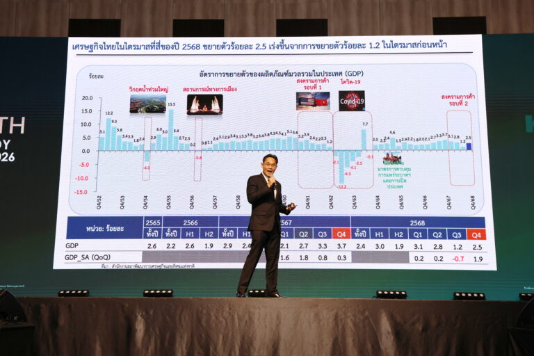 วันนี้ (23 กุมภาพันธ์ 2569) นายดนุชา พิชยนันท์ เลขาธิการสภาพัฒนาการเศรษฐกิจและสังคมแห่งชาติ เป็นวิทยากรบรรยายพิเศษในหัวข้อ “Thailand’s Next Wave, Economic Momentum” ภายในงานสัมมนา K WEALTH FORUM 2026 จัดโดยธนาคารกสิกรไทย โดยได้นำเสนอข้อมูลทิศทางเศรษฐกิจไทยอย่างมีนัยสำคัญ ท่ามกลางบรรยากาศความผันผวนของบริบทโลก ณ ห้องบางกอกคอนเวนชัน เซ็นเตอร์ โรงแรมเซ็นทาราแกรนด์ แอทเซ็นทรัลเวิลด์