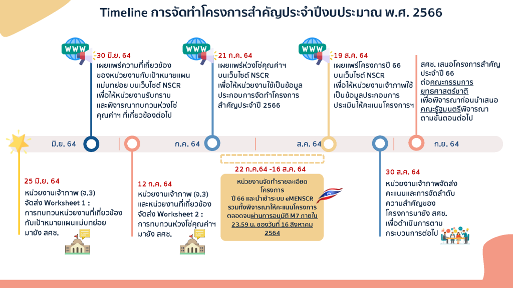 Timeline การดำเนินการตามกระบวนการจัดทำโครงการเพื่อขับเคลื่อนการบรรลุเป้าหมายตามยุทธศาสตร์ชาติ ประจำปี พ.ศ. 2566