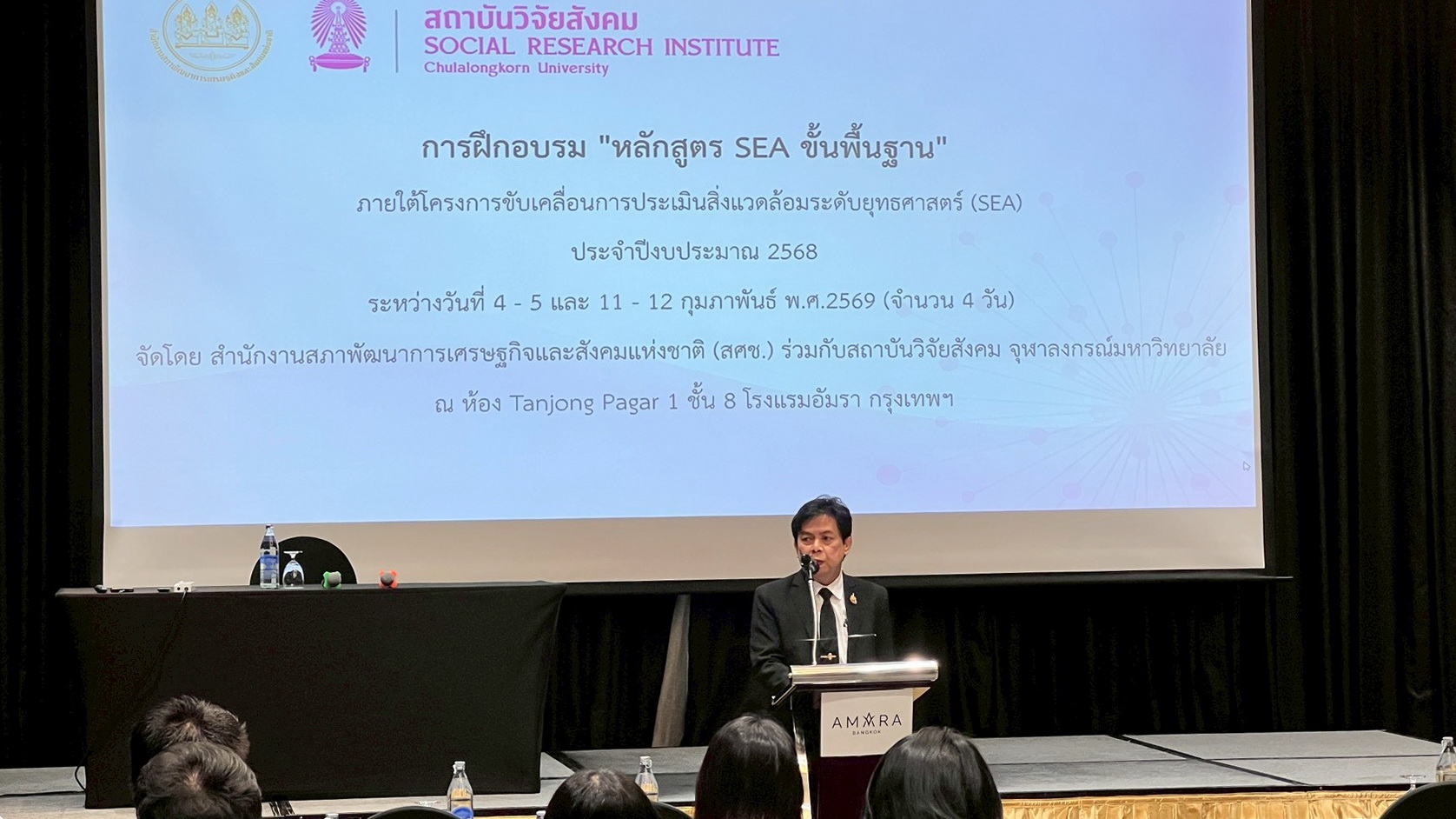 เมื่อวันที่ 4 กุมภาพันธ์ 2569 สำนักงานสภาพัฒนาการเศรษฐกิจและสังคมแห่งชาติ (สศช.) โดยกองยุทธศาสตร์การพัฒนาทรัพยากรธรรมชาติและสิ่งแวดล้อม ร่วมกับ สถาบันวิจัยสังคม จุฬาลงกรณ์มหาวิทยาลัย จัดฝึกอบรม “หลักสูตรการประเมินสิ่งแวดล้อมระดับยุทธศาสตร์ (SEA) ขั้นพื้นฐาน” โดยมี ดร.วิชญายุทธ บุญชิต รองเลขาธิการสภาพัฒนาการเศรษฐกิจและสังคมแห่งชาติ เป็นประธานกล่าวเปิดการฝึกอบรม ณ ห้อง Tanjong Pagar 1 โรงแรมอัมรา ถ.สุรวงศ์ กรุงเทพมหานคร