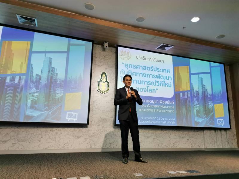 การบรรยายดังกล่าว เลขาธิการ สศช. ได้กล่าวถึงทิศทางการพัฒนาในสถานการณ์วิถีชีวิตใหม่โลกที่สำคัญๆ อาทิ บริบทการพัฒนา ทั้งแนวโน้มระดับโลก (Megatrends) และผลกระทบและแนวโน้มการเปลี่ยนแปลงจากโควิด-19 ทิศทางการวางแผน และการจัดทำแผนพัฒนาเศรษฐกิจและสังคมแห่งชาตจิ ฉบับที่ 13 โดยแนวโน้มระดับโลกที่มีผลต่อการพัฒนาที่สำคัญๆ อาทิ ความก้าวหน้าทางเทคโนโลยี เช่น Digital Transformation ซึ่งจะเป็นโอกาสในการยกระดับการพัฒนาแต่ก็เป็นความเสี่ยงต่อการจ้างงาน การเปลี่ยนแปลงโครงสร้างประชากร จากการที่สัดส่วนผู้สูงอายุเพิ่มขึ้นต่อเนื่อง ส่งผลให้แรงงานลดลง การเปลี่ยนแปลงวิถีชีวิตและวัฒนธรรมทางสังคม พบว่าคนเจนเนอเรชันวายมีแนวโน้มย้ายถิ่นและย้ายงานสูงขึ้น และค่านิยมการดำรงชีวิตเปลี่ยนไป การเปลี่ยนแปลงสภาพภูมิอากาศ มีแนวโน้มรุนแรง รวดเร็ว และผันผวนกว่าที่คาดการณ์ไว้ เป็นต้น