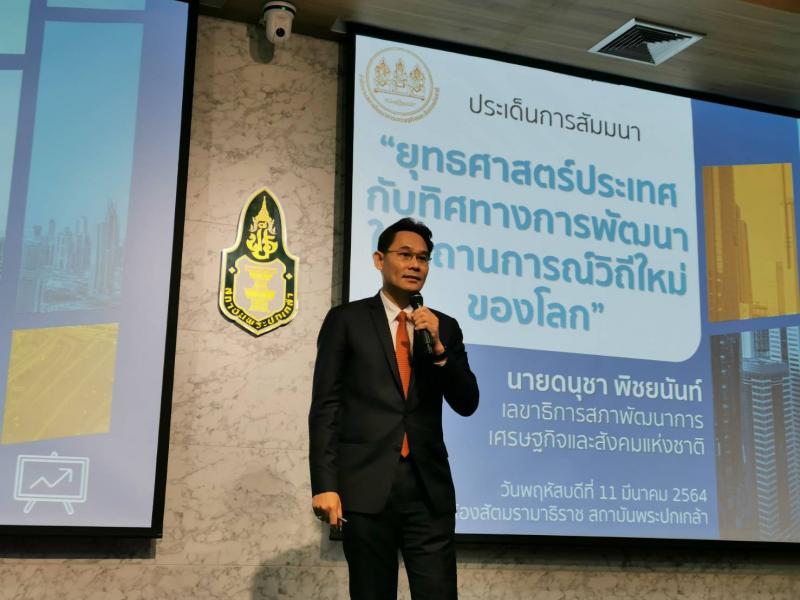 เมื่อวันที่ 11 มีนาคม 2564 นายดนุชา พิชยนันท์ เลขาธิการสภาพัฒนาการเศรษฐกิจและสังคมแห่งชาติ ร่วมเป็นวิทยากรบรรยายการสัมมนาแลกเปลี่ยนประสบการณ์และแนวทางดำเนินงานในอนาคตสำหรับนายกองค์การบริหารส่วนจังหวัด ในประเด็น “ยุทธศาสตร์ประเทศกับทิศทางการพัฒนาในสถานการณ์วิถีใหม่ของโลก” ณ สถาบันพระปกเกล้า ศูนย์ราชการเฉลิมพระเกียรติฯ จัดโดย วิทยาลัยพัฒนาการปกครองท้องถิ่น สถาบันพระปกเกล้า โดยผู้เข้าร่วมสัมมนาประกอบด้วย นายกองค์การบริหารส่วนจังหวัด จาก 76 จังหวัด เพื่อแลกเปลี่ยนประสบการณ์สมัยใหม่ในบริบทของการบริหารงานระดับจังหวัด และแนวทางการพัฒนาองค์กรเพื่อรับมือกับความท้าทายใหม่ ตลอดจนเสริมสร้างเครือข่ายความร่วมมือระหว่างองค์การบริหารส่วนจังหวัด