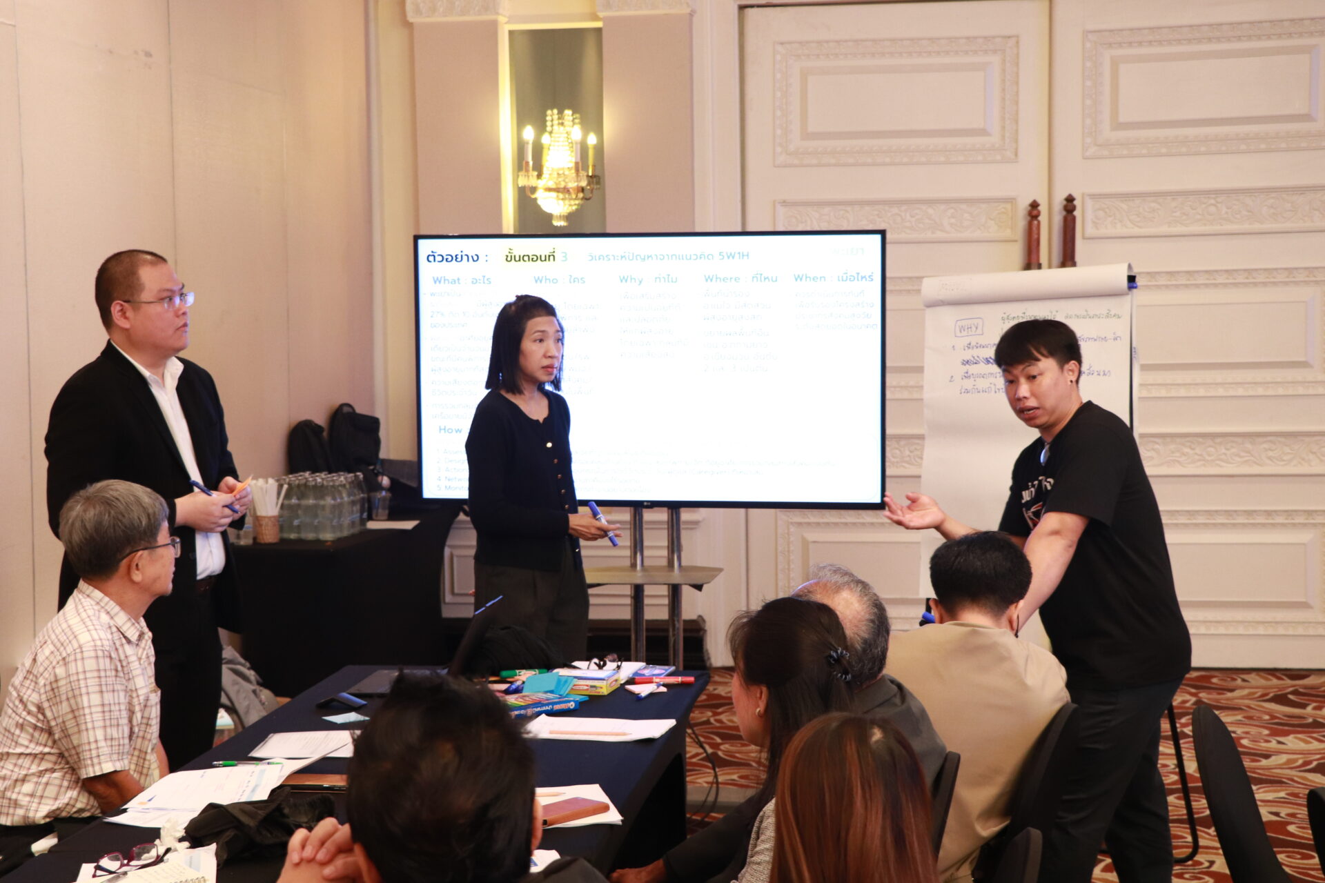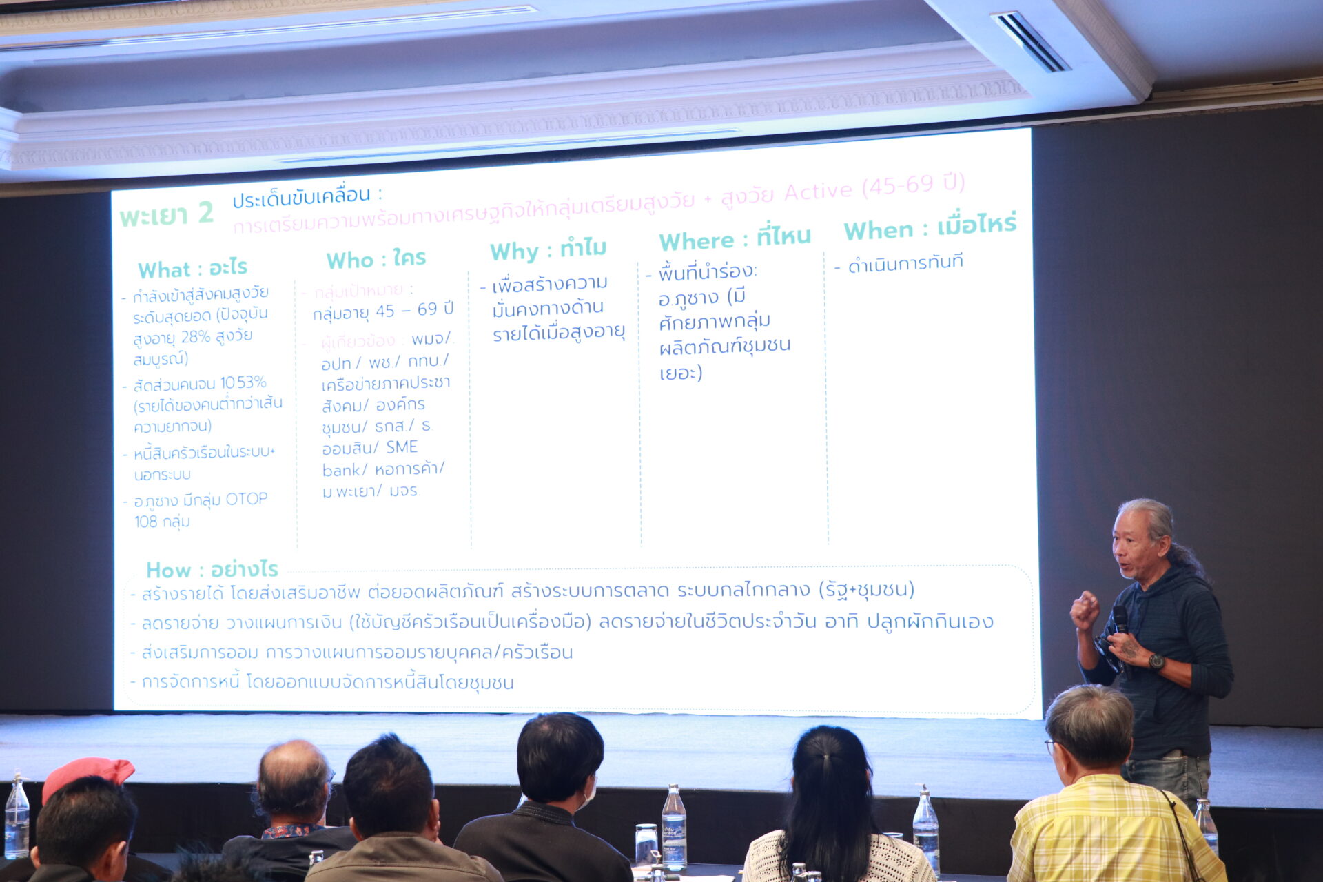 จากนั้นเป็นการแบ่งกลุ่มย่อยทำกระบวนการทดลองใช้แพลตฟอร์ม TISEP วิเคราะห์ประเด็นปัญหาและจัดทำแนวคิดข้อเสนอโครงการภายใต้หลักฐานเชิงประจักษ์ด้วยกรอบ 5W1H ได้ตัวอย่างแนวคิดและข้อเสนอดังนี้ จังหวัดลำพูน ให้ความสำคัญกับข้อมูลโครงสร้างประชากรที่สะท้อนว่าสังคมสูงวัยในจังหวัดลำพูนอยู่ในระดับสุดยอด มีผู้สูงอายุ 28% ติด 10 อันดับแรกของประเทศ และมลพิษในสิ่งแวดล้อมที่ส่งผลต่อคุณภาพชีวิต ผ่านข้อมูลดัชนีชี้วัด HAI มิติด้านสุขภาพ และด้านที่อยู่อาศัยและสิ่งแวดล้อม โดยมีข้อเสนอเรื่อง การช่วยเหลือผู้สูงอายุที่พิการและตกหล่นในพื้นที่ห่างไกล เพื่อยกระดับคุณภาพชีวิตของผู้สูงอายุที่มีความพิการและกลุ่มผู้สูงอายุที่ตกหล่นจากระบบการช่วยเหลือของภาครัฐ ทั้งด้านสุขภาพกายและสุขภาพจิตใจ โดยดำเนินการค้นหาและระบุตัวตนกลุ่มเป้าหมายผ่านการบูรณาการข้อมูลดิจิทัลเชิงพื้นที่ควบคู่กับการลงพื้นที่สำรวจข้อเท็จจริง พร้อมทั้งจัดหาอุปกรณ์และบริการที่จำเป็น และพัฒนาระบบติดตามคุณภาพชีวิตอย่างต่อเนื่อง โดยอาศัยการมีส่วนร่วมของภาคประชาสังคม และการสร้างพื้นที่ต้นแบบคนอยู่กับป่าเพื่อฟื้นฟูระบบนิเวศและวัฒนธรรม โดยส่งเสริมการท่องเที่ยวเชิงนิเวศและวัฒนธรรม “แห่ช้างเผือก” ในพื้นที่ต้นแบบที่คณะกรรมการนโยบายที่ดินแห่งชาติจัดสรรที่ดินทำกินในเขตป่าสงวนฯ ให้แก่ชุมชน เพื่อสะท้อนบทบาทการร่วมจัดการทรัพยากรตั้งแต่ต้นน้ำถึงปลายน้ำ ร่วมกับสร้างกลไกและระบบข้อมูลทรัพยากรในพื้นที่ ควบคู่กับการปลูกจิตสำนึก โดยเฉพาะในกลุ่มคนรุ่นใหม่ ให้เห็นคุณค่าการอนุรักษ์วิถีชีวิตที่อยู่ร่วมกับธรรมชาติอย่างยั่งยืน และ จังหวัดพะเยา มุ่งแก้ปัญหาเรื่องผู้สูงอายุโดยเฉพาะผู้สูงอายุกลุ่มเปราะบาง จากข้อมูลโครงสร้างประชากรที่ผู้สูงอายุและคนพิการ (ส่วนใหญ่เป็นผู้สูงอายุ) มีอัตราเพิ่มขึ้นต่อเนื่อง ข้อเสนอจึงประกอบด้วยการเสริมสร้างสุขภาวะสู่คุณภาพชีวิตที่ดีของผู้สูงอายุในจังหวัดพะเยา เพื่อส่งเสริมสุขภาวะด้านการดูแลสุขภาพของผู้สูงอายุแบบบูรณาการร่วมกับชุมชน ควบคู่กับการเสริมสร้างองค์ความรู้และความเข้าใจให้ผู้สูงอายุมีความพร้อมในการตั้งรับและปรับตัวต่อสถานการณ์ภัยพิบัติ โดยใช้กลไกสวัสดิการชุมชนเพื่อสนับสนุนค่าใช้จ่ายที่จำเป็น อาทิ จัดบริการรับ-ส่งผู้สูงอายุไปโรงพยาบาล และการเตรียมความพร้อมรับมือก่อนเกิดภัยพิบัติในพื้นที่ดำเนินการ และการเตรียมความพร้อมทางเศรษฐกิจให้กลุ่มเตรียมสูงวัย และผู้สูงอายุที่มีพลัง (Active Aging)