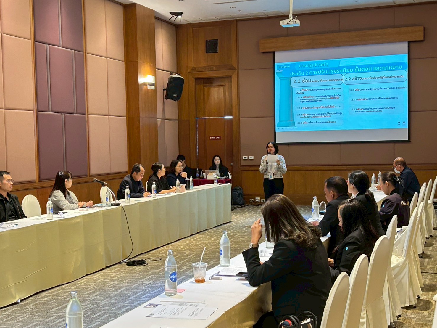 นางสาววรวรรณ พลิคามิน รองเลขาธิการสภาพัฒนาการเศรษฐกิจและสังคมแห่งชาติ นำเสนอสาระสำคัญ และแนวทางพัฒนาในร่างกรอบแผนพัฒนาเศรษฐกิจและสังคมแห่งชาติ ฉบับที่ 14 (พ.ศ. 2571-2575) ที่มุ่งเน้นการมีส่วนร่วมจากทุกภาคส่วนในการร่วมกำหนดทิศทางอนาคตของประเทศ พร้อมชี้ให้เห็นถึงความท้าทายจากการที่ตัวชี้วัดหลายตัวในแผนฉบับปัจจุบันยังไม่บรรลุเป้าหมาย ประกอบกับปัจจัยเสี่ยงด้านภูมิรัฐศาสตร์ การเปลี่ยนแปลงสภาพภูมิอากาศ ความก้าวหน้าทางเทคโนโลยี และการเข้าสู่สังคมสูงวัยระดับสุดยอดในปี พ.ศ. 2576 แนวทางการพัฒนาในแผนพัฒนาฯ ฉบับที่ 14 จึงมีวัตถุประสงค์เพื่อซ่อมแซมจุดเปราะบางเสริมรากฐานให้มั่นคง และสร้างความพร้อมและเพิ่มโอกาสของประเทศสำหรับอนาคต โดยตั้งอยู่บน 5 เสาหลักสำคัญ ได้แก่ การพลิกโฉมโครงสร้างเศรษฐกิจ การปฏิรูปภาครัฐ การยกระดับทุนมนุษย์ การสร้างความยั่งยืนทางสิ่งแวดล้อม และการถ่ายทอดเทคโนโลยีนวัตกรรม ทั้งนี้ สศช. คาดหวังว่าแผนฉบับนี้จะเป็นแผนที่ทุกภาคส่วนร่วมกันเป็นเจ้าของ และสามารถนำไปปฏิบัติให้เกิดผลได้อย่างเป็นรูปธรรม จากนั้น การระดมความคิดเห็นได้แบ่งออกเป็นห้องย่อยตาม 5 เสาหลักการพัฒนา และมีผู้แทนจากภาคส่วนต่าง ๆ ร่วมแสดงความคิดเห็นตามความเชี่ยวชาญและความสนใจอย่างเต็มที่
