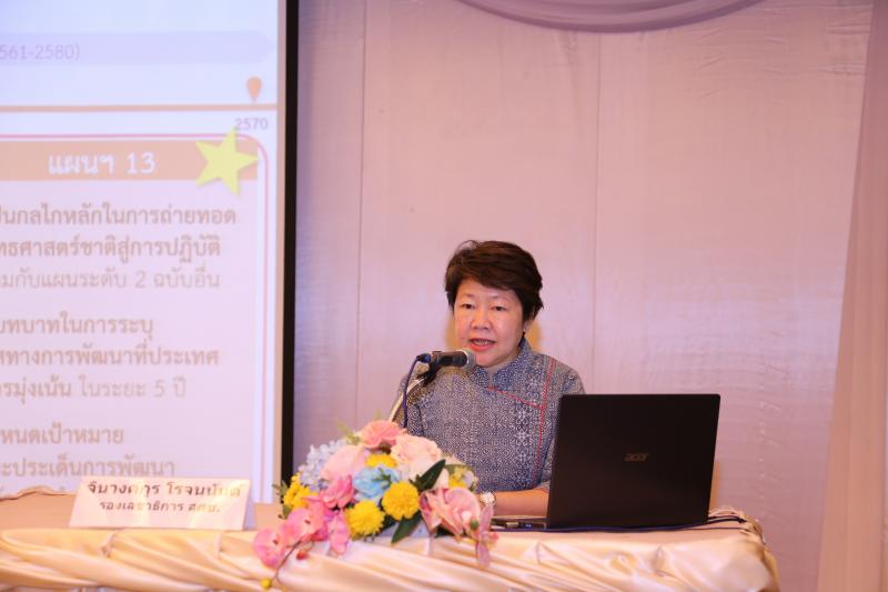 จากนั้น นางสาวจินางค์กูร โรจนนันต์ รองเลขาธิการสภาพัฒนาการเศรษฐกิจและสังคมแห่งชาติ ได้นำเสนอ “ร่างกรอบแผนพัฒนาฯ ฉบับที่ 13” ซึ่งมีเป้าหมายเพื่อพลิกโฉมประเทศไทยสู่ “เศรษฐกิจสร้างคุณค่า สังคมเดินหน้าอย่างยั่งยืน” โดยจะมีการเปลี่ยนผ่านประเทศใน 4 ด้านหลัก ได้แก่ ด้านที่ 1 เน้นการสร้างเศรษฐกิจมูลค่าสูงที่เป็นมิตรกับสิ่งแวดล้อม ด้านที่ 2 การสร้างสังคมแห่งโอกาสและความเสมอภาค ด้านที่ 3 การปรับเปลี่ยนไปสู่วิถีชีวิตที่มีความยั่งยืนเป็นมิตรกับสิ่งแวดล้อมและปลอดภัย และด้านที่ 4 ปัจจัยสนับสนุนการผลิกโฉมประเทศ โดยการสร้างกำลังคนและภาครัฐที่มีสมรรถนะสูง
